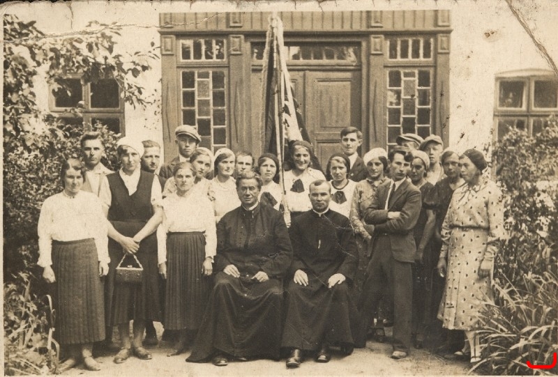 Młodzież z katolickich stowarzyszeń z księdzem proboszczem Adamem Żorem i wikarym, lata 30 XX w.