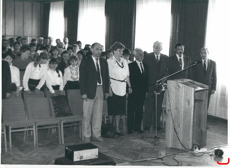 Sala GOK w Czarnożyłach. Stoją od prawej: Andrzej Chowis (sekretarz Gminnego Komitetu ZSL w Czarnożyłach), Piotr Banaś (naczelnik Urzędu Gminy), Piotr Ciborski (działacz ZSL, przewodniczący Gminnej Komisji Rewizyjnej), Tadeusz Krysztofiński (prezes Gminnego Komitetu ZSL w Czarnożyłach, Teresa Niepiekło (sekretarz Komitetu Gminnego PZPR), Jan Wolniak (I sekretarz KG PZPR w Czarnożyłach) oraz młodzież szkolna, 1989r.