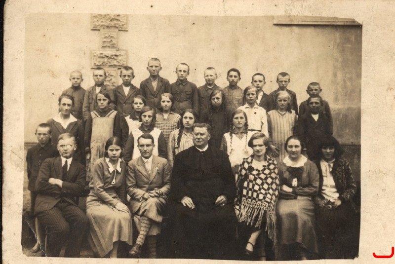 Uczniowie szkoły w Czarnożyłach z nauczycielami i księdzem proboszczem Adamem Żorem; po jego bokach siedzą: Bolesław Mielczarek (kierownik szkoły) i Kazimiera Mielczarkowa, lata 30 XX w.