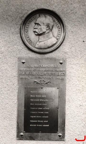 Tablica pamiątkowa poświęcona poległym i zmarłym żołnierzom wojny bolszewickiej, powyżej medalion z wizerunkiem J. Piłsudskiego, ok. 1935r. Tablica do dzisiaj znajduje się na budynku Urzędu Gminy w Czarnożyłach.